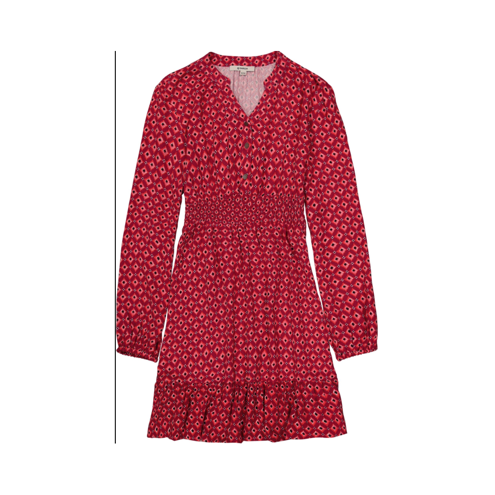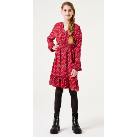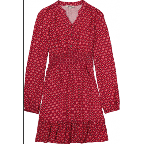 Robe manches longues rouge à motifs.