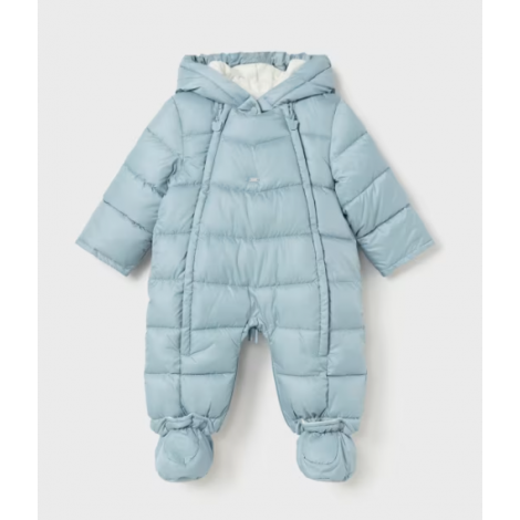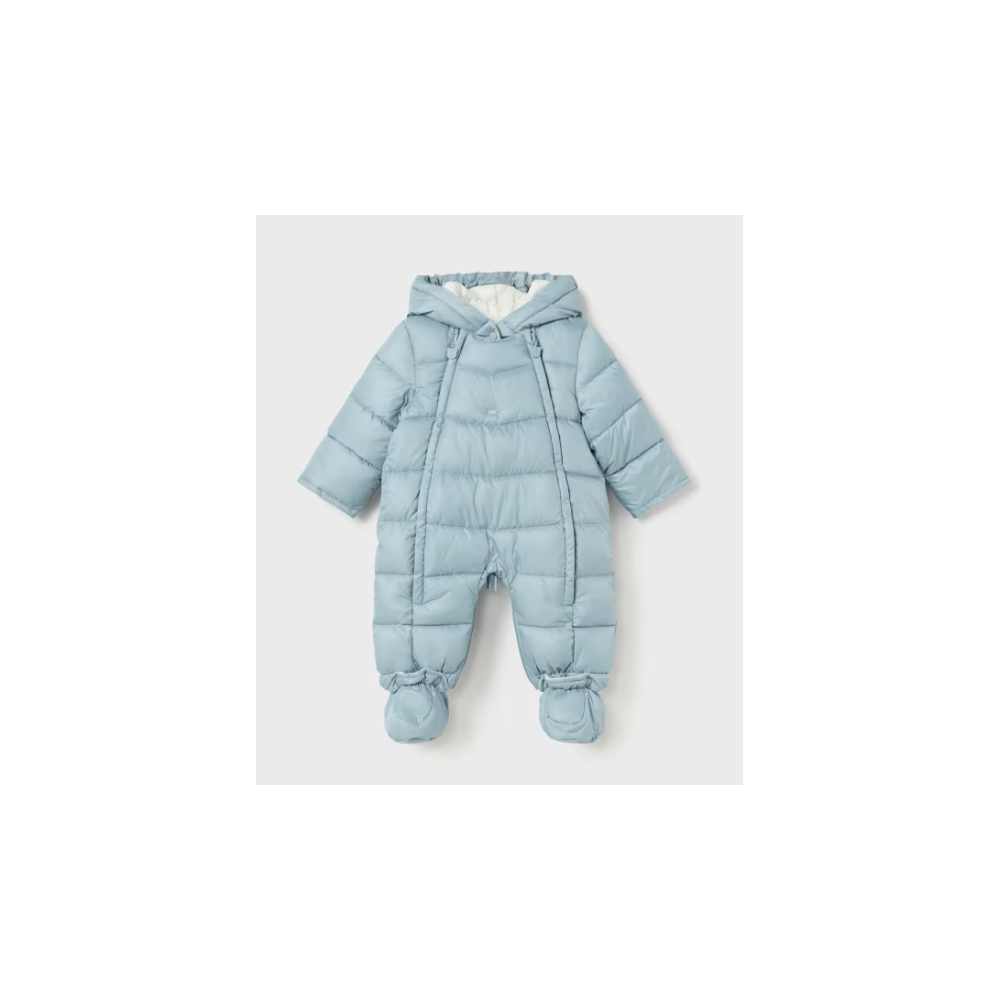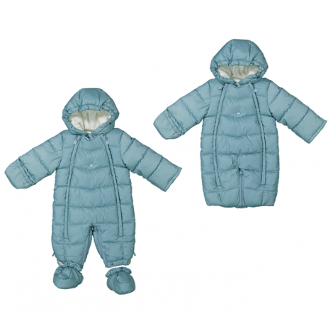 Combinaison à manches longues pour nouveau-né. Col à capuche. Fermeture éclair centrale sur le devant. Cette combinaison peut être transformée en sac grâce à son système spécial de fermeture éclair et de boutons.
