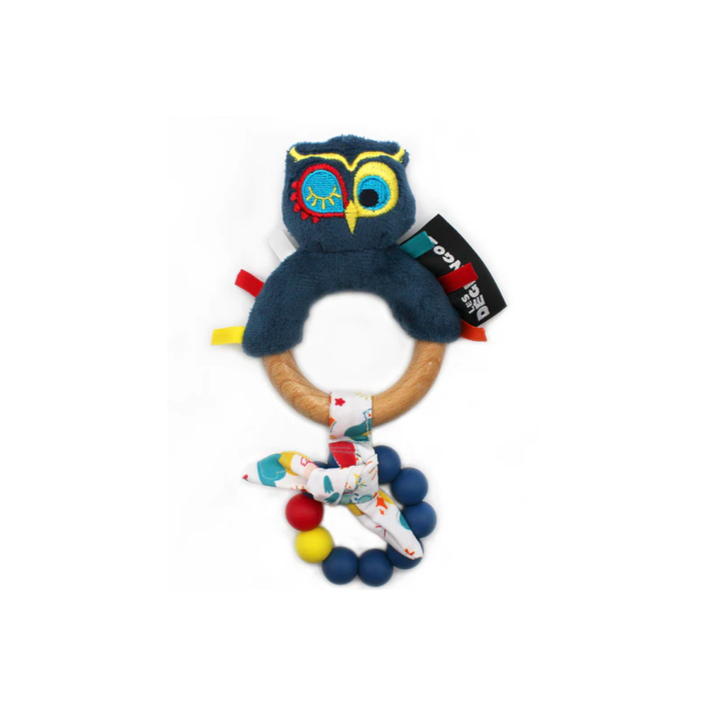 Ce jouet à mordiller est le bon compromis entre un anneau de dentition et un jouet d'éveil grâce aux différentes matières qui le composent.