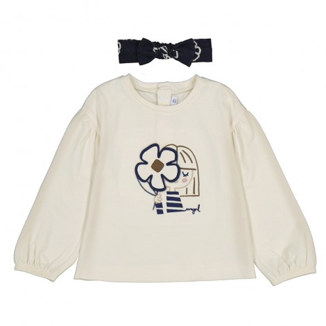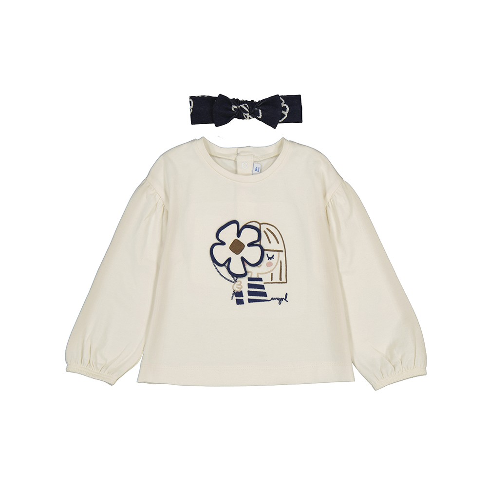 Bandeau bleu marine, orné d’un nœud central et d’un motif clair coordonné à l’illustration du t-shirt.