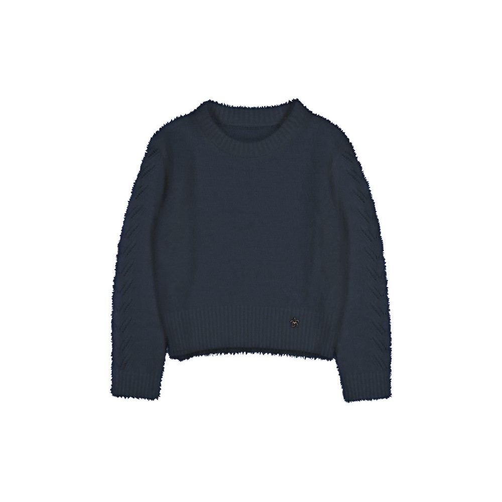 Pull en maille bleu marine, à la coupe classique et légèrement courte.