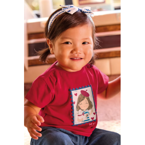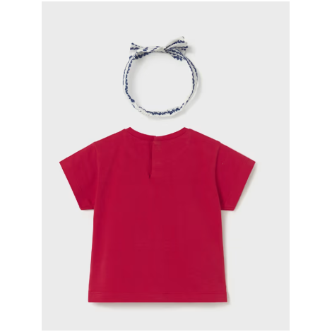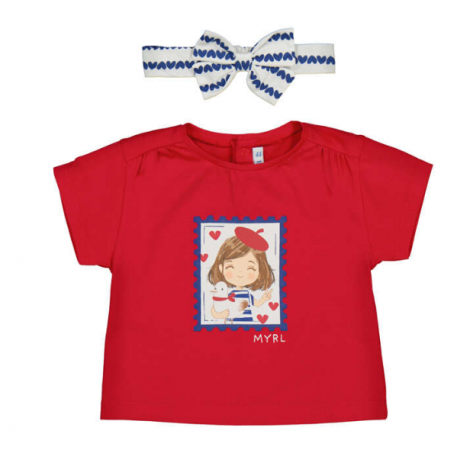 T-shirt de couleur rouge vif, à manches courtes, accompagné de son bandeau assorti. Le t-shirt est décoré d’une illustration imprimée sur le devant représentant une petite fille au style marin, avec des détails en bleu, blanc et rouge et de petits cœurs, pour un look doux et plein de charme.