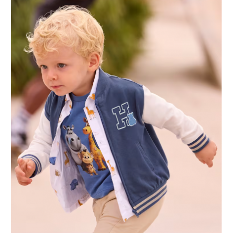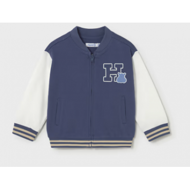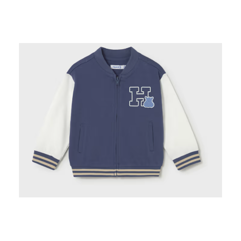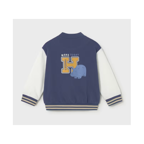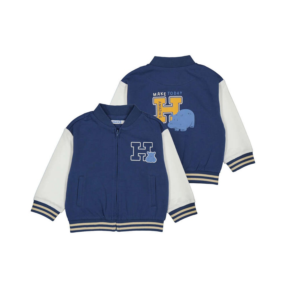Veste zippée style teddy, coloris bleu marine avec manches contrastées écru. Détails imprimés sur le devant et au dos, poignets et base en bord-côtes rayé. Confortable et tendance, idéale pour la mi-saison.