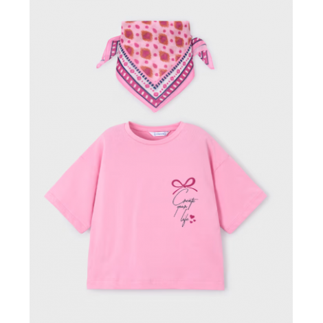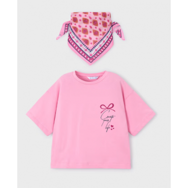Ensemble composé d’un t-shirt rose à manches courtes, coupe ample et confortable. Petit imprimé décoratif sur la poitrine. Livré avec un foulard assorti à motifs roses, idéal pour compléter la tenue. Parfait pour un look estival doux et tendance.