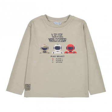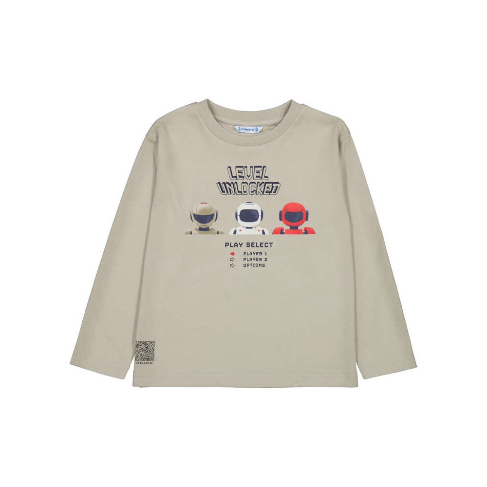 T-shirt manches longues coloris beige, confortable et agréable à porter. Imprimé ludique « Level Unlocked » avec personnages style jeu vidéo et menu interactif sur le devant. Petit détail QR code en bas. Idéal pour un look moderne et fun au quotidien.
