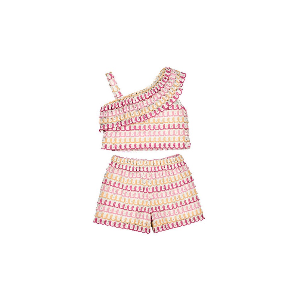 Ensemble estival composé d’un top asymétrique à une bretelle et d’un short assorti. Motif graphique multicolore avec finitions festonnées pour une touche originale. Léger et confortable, idéal pour les journées ensoleillées et les looks tendance.