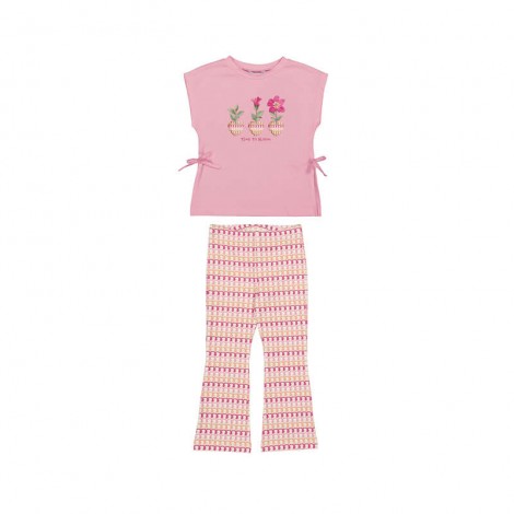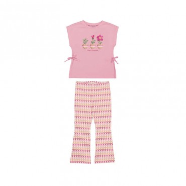 Ensemble deux pièces composé d’un t-shirt rose à manches courtes avec nœuds décoratifs sur les côtés. Motif floral imprimé sur le devant pour une touche fraîche et estivale. Legging assorti à imprimé coloré, coupe ajustée et bas légèrement évasé pour un style tendance. Confortable et charmant, idéal pour les journées ensoleillées.