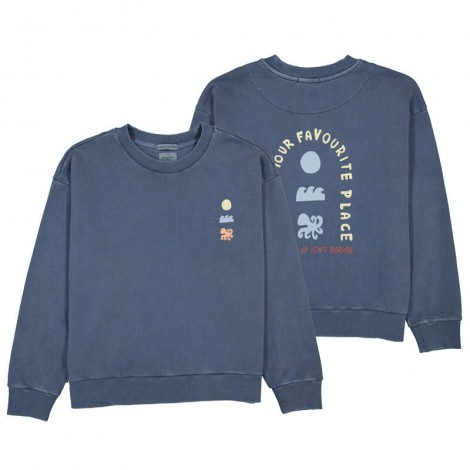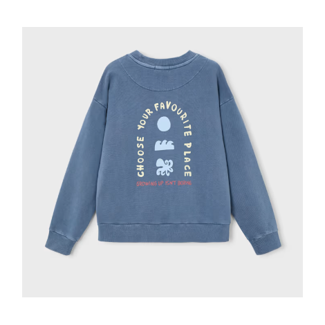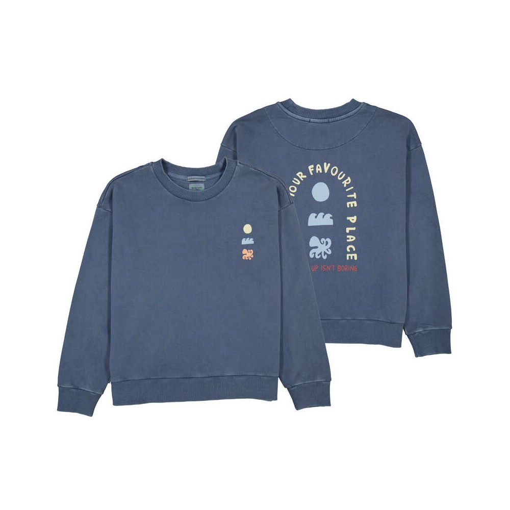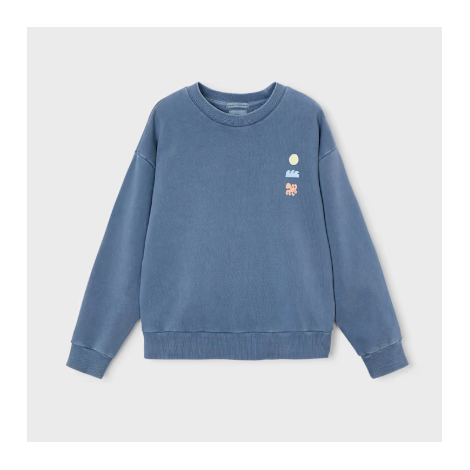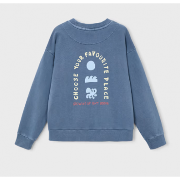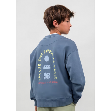 Sweat en coloris bleu ardoise, coupe confortable avec col rond et finitions côtelées aux poignets et à la base. Petit motif discret sur le devant et grand imprimé graphique au dos avec inscription pour un style moderne et original. Idéal pour un look casual au quotidien.