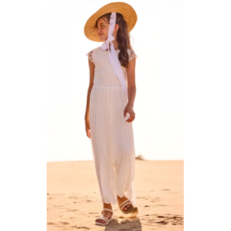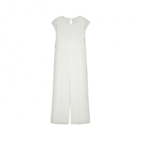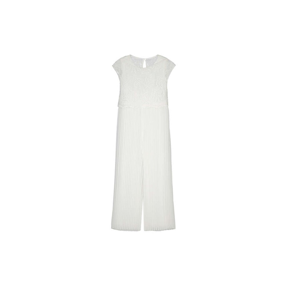 Combinaison sans manches en coloris blanc, idéale pour une occasion spéciale. Haut en matière délicatement texturée avec fermeture discrète au dos. Bas large et plissé offrant une silhouette fluide et élégante. Une pièce chic et raffinée, parfaite pour une cérémonie ou un événement.
