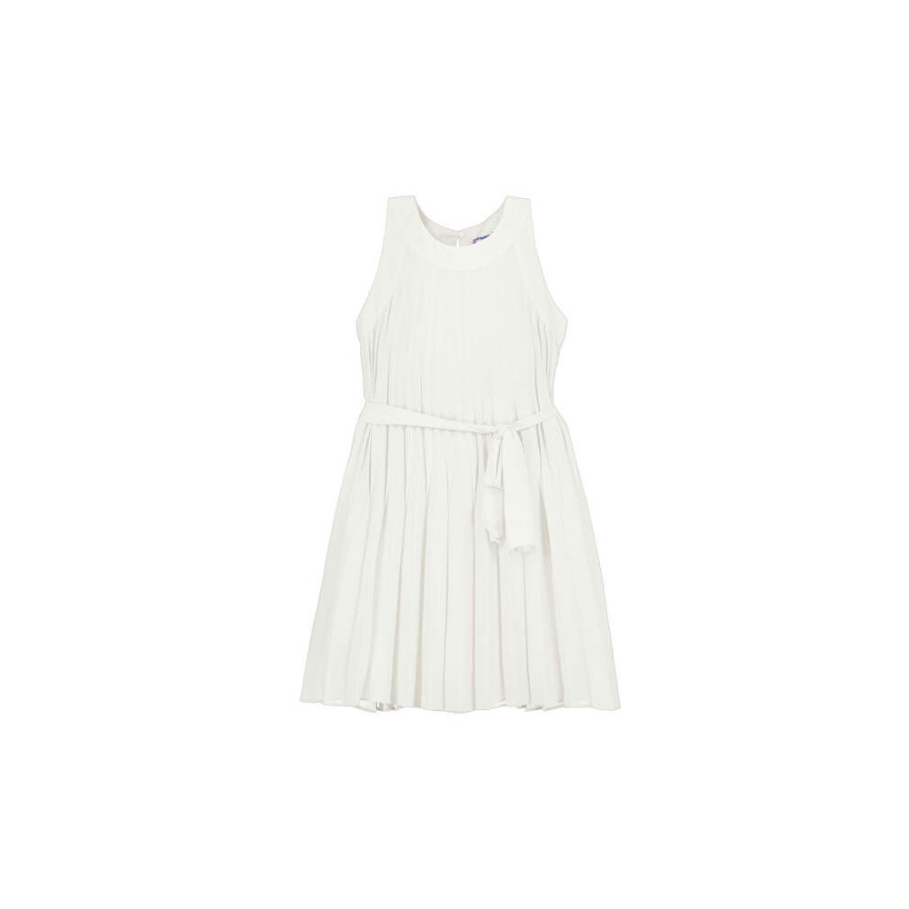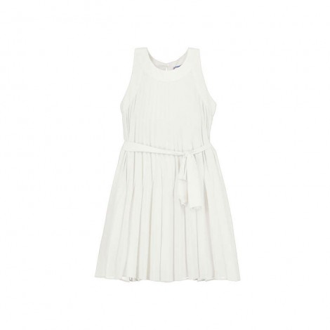 Robe sans manches en coloris écru, à la coupe fluide et élégante. Taille marquée par une ceinture ton sur ton à nouer pour une silhouette harmonieuse. Jupe légèrement évasée offrant un joli mouvement. Idéale pour une cérémonie ou une occasion spéciale.