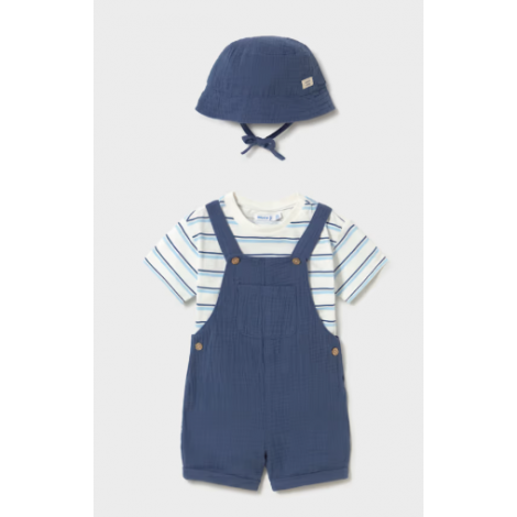 Ensemble trois pièces composé d’une salopette short bleu avec bretelles boutonnées et poche poitrine, idéale pour un look estival. T-shirt blanc à manches courtes à rayures bleu et blanc pour une touche marine. Bob assorti bleu avec lien à nouer pour une protection optimale. Un ensemble confortable et tendance pour les beaux jours.