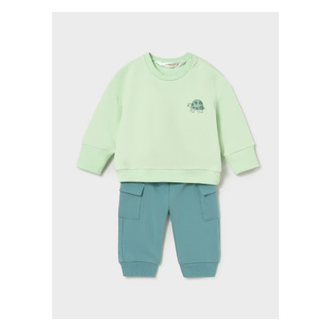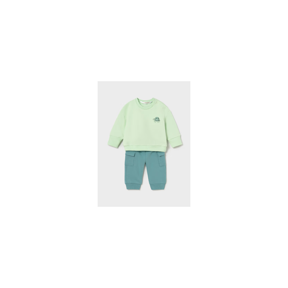 Ensemble composé d’un sweat vert pastel à manches longues avec petit motif discret sur la poitrine. Col rond et finitions bord-côte pour un confort optimal. Pantalon assorti vert plus soutenu avec poches latérales style cargo et chevilles élastiquées pour un maintien parfait.