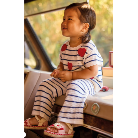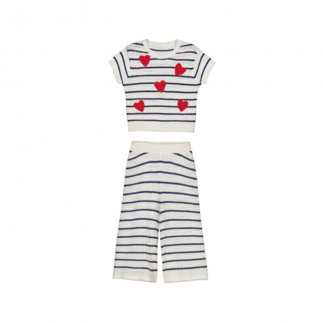 Ensemble en maille composé d’un top à manches courtes rayé bleu marine et blanc, agrémenté de jolis cœurs rouges en relief pour une touche pleine de douceur. Encolure ronde et finitions festonnées pour un rendu délicat.